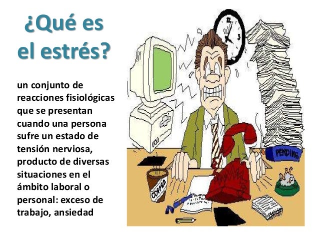 Qué es el estrés. Puede provenir de cualquier situación o pensamiento que lo haga sentir a uno frustrado furioso o nervioso. Cuando esta respuesta natural se da en exceso se produce una.